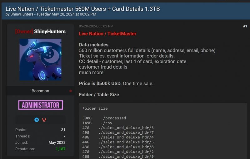 Дело в том, что ShinyHunters не только восстановил сайт, но и выставил на продажу БД объемом 1,3 ТБ, содержащую данные 560 млн клиентов Ticketmaster (один из крупнейших в США сервисов по продаже билетов), оценив дамп в 500 000 долларов. Ранее эта БД выставлялась на продажу на русскоязычном хак-форуме Exploit.