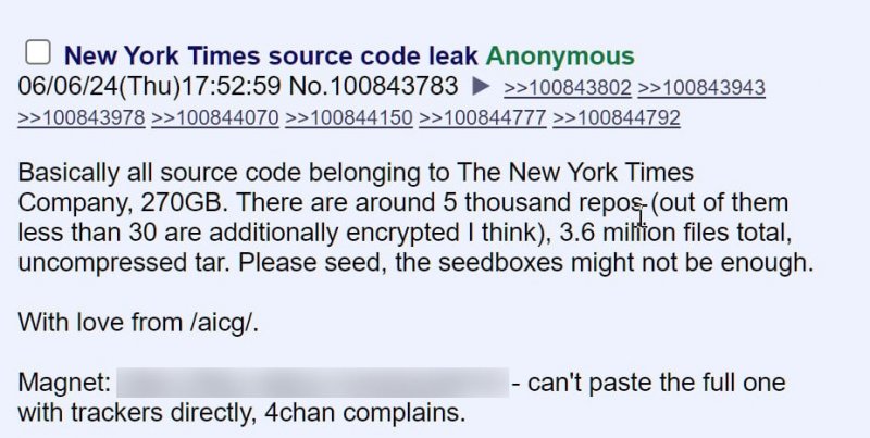 «В принципе, это весь исходный код The New York Times Company, 270 ГБ. В архиве около 5000 репозиториев (думаю, менее 30 из них дополнительно зашифрованы), всего 3,6 млн файлов, несжатый tar», — писал аноним.
