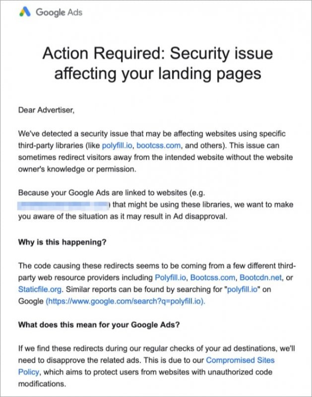 Отметим, что Bootcss, BootCDN и Staticfile, наряду с polyfill[.]io, уже упоминались в предупреждении, которое компания Google начала рассылать рекламодателям на этой неделе. В письме Google сообщала об атаке на цепочку поставок, предупреждая, что целевые страницы сайтов содержат вредоносный код и могут перенаправлять посетителей на другие ресурсы без ведома или разрешения со стороны владельца сайта.