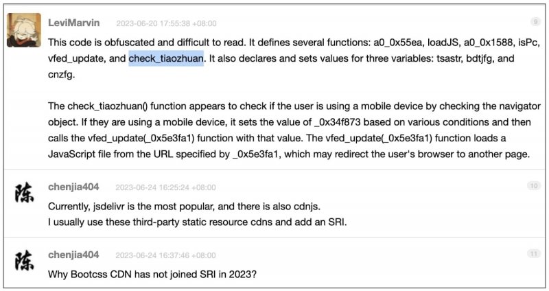 Журналисты Bleeping Computer пишут, что им удалось получить независимое подтверждение того, что начиная с 20 июня 2023 года на некоторых китайских форумах встречались обсуждения, где разработчики пытались расшифровать и понять необычный обфусцированный код, поставляемый BootCSS. По их словам, функция check_tiaozhuan определяла, работает ли посетитель с мобильного устройства, и «перенаправляла браузер пользователя на другую страницу».