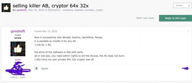 Дальнейшее исследование показало, что с 2022 года злоумышленники под никами goodsoft, lefroggy, killerAV и Stupor продают AV Killer на русскоязычных хак-форумах по цене от 4000 до 15 000 долларов США.
