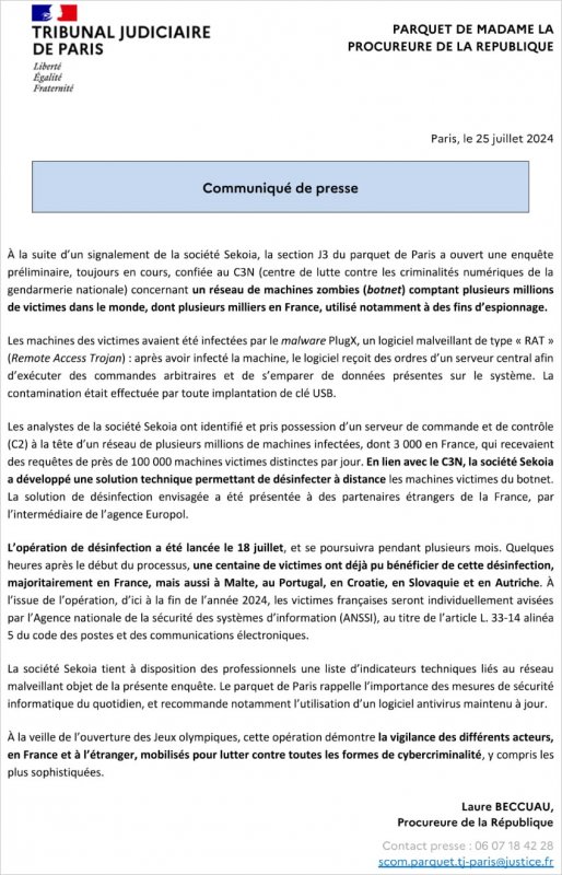 В связи с Олимпийскими играми 2024 года, которые стартуют в Париже на этой неделе, французские власти, признали неприемлемым риск, исходящий от 3000 зараженных PlugX систем, найденных во Франции.