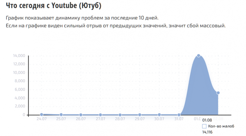 Вчера, 1 августа 2024 года, в работе YouTube на территории России началась массовые и заметные проблемы. Так, по данным сервиса «Сбой.рф» на проблемы с YouTube только вчера пожаловались более 14 000 человек.