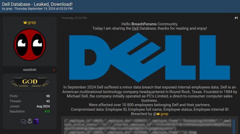 На прошлой неделе на хакерском форуме BreachForums появилась информация о том, в сентябре 2024 года у компании Dell произошла «незначительная утечка данных», в результате которой была раскрыта внутренняя информация о 10 000 сотрудниках и партнерах.