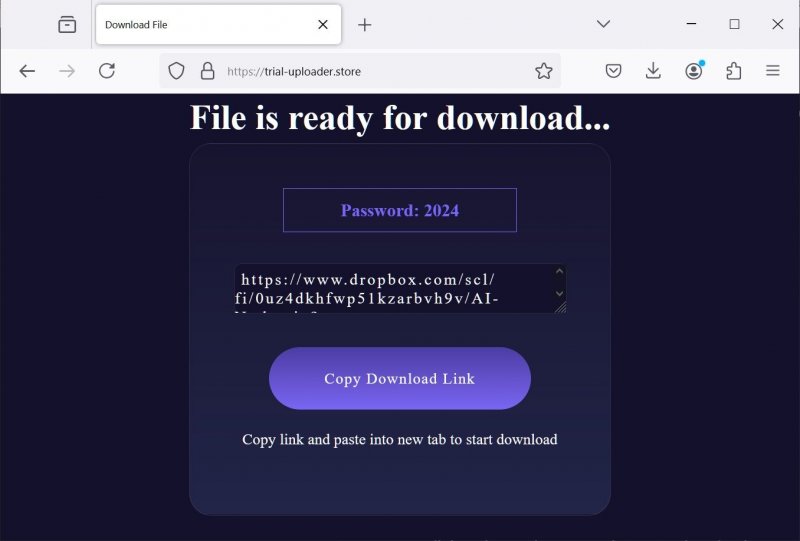 В результате жертва попадала на другой сайт, где ей предоставляли ссылку и пароль для доступа к защищенному архиву, размещенному в Dropbox.