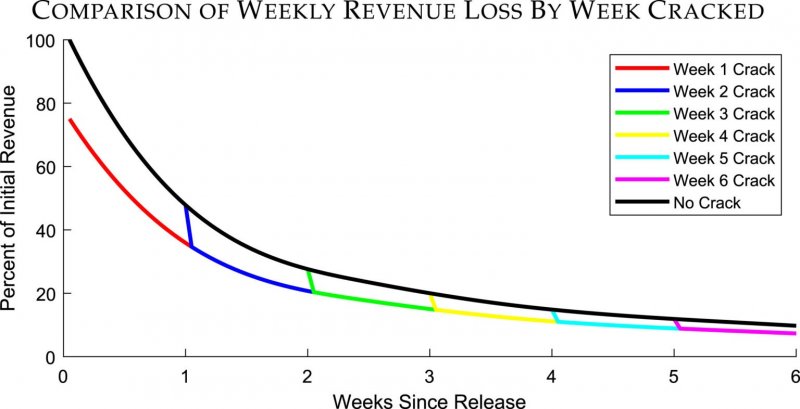 Но если кряк появляется через шесть недель после релиза игры, это уже лишает издателя лишь 5% от теоретического дохода. Через 12 недель новые продажи игры и вовсе становятся настолько незначительными, что «разработчики уже могут удалить непопулярные механизмы DRM с минимальными потерями (и, возможно, даже получат прибыль от потребителей, не приемлющих DRM)», — предполагает исследователь.
