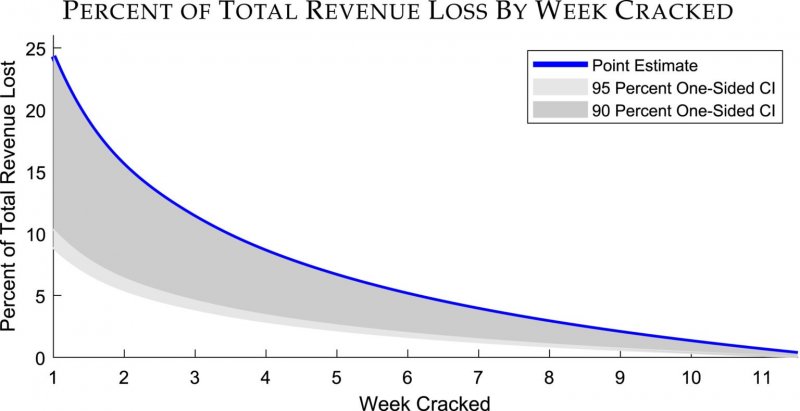 Различные сроки появления кряков тоже помогают в сравнительном анализе, поскольку, по словам исследователя, «доходы наиболее высоки ближе к дате релиза, поэтому кряк, появившийся ближе к дате релиза, оказывает непропорционально большое влияние».
