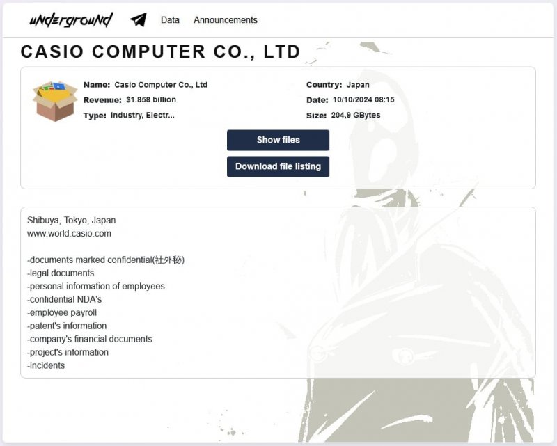 5 октября 2024 года японская компания Casio обнаружила несанкционированный доступ к своей сети. Этот инцидент привел к сбоям в работе ряда систем и некоторых сервисов. Теперь ответственность за эту атаку взяла на себя вымогательская группировка Underground.