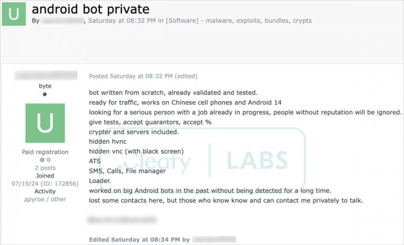 Среди ключевых особенностей малвари исследователи перечисляют: кейлоггинг, наложение фальшивых оверлеев поверх окон настоящих приложений, перехват SMS-сообщений, а также модуль VNC (Virtual Network Computing), который позволяет злоумышленникам удаленно контролировать зараженное устройство, выполнять команды и отключать экран, чтобы скрыть вредоносную активность.
