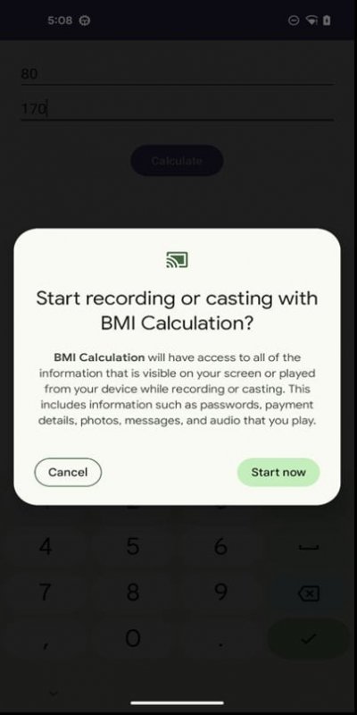 Во-первых, приложение запускало сервис для записи экрана устройства, который запрашивал соответствующее разрешение, когда пользователь нажимал кнопку «Рассчитать». В результате многие могли дать согласие и нажать на кнопку рефлекторно.