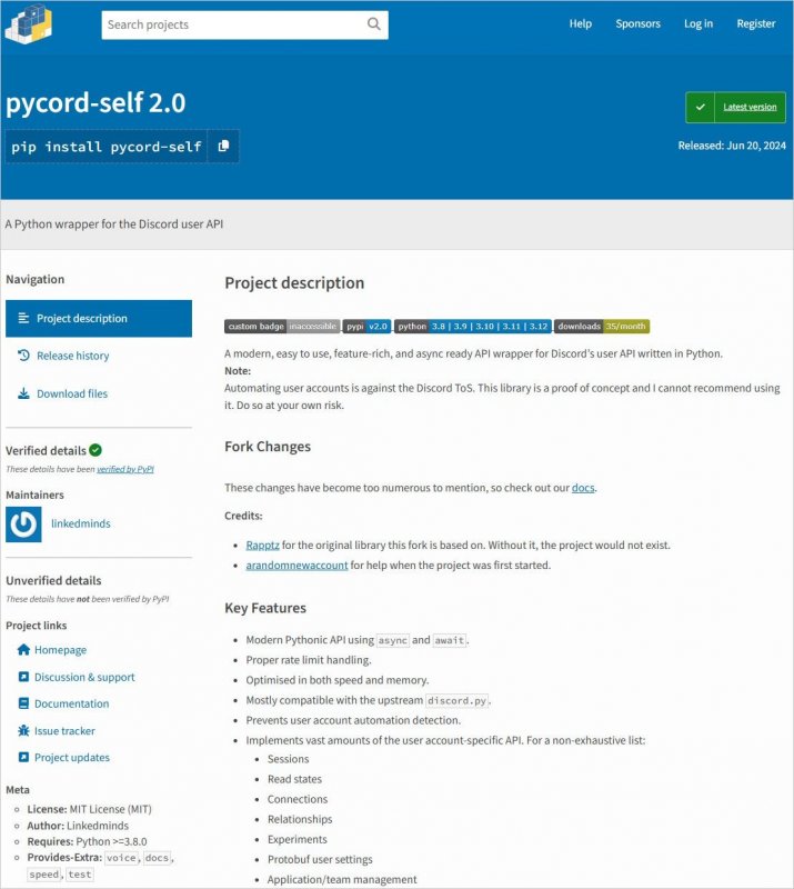 Вредоносный пакет маскируется под популярный discord.py-self (28 млн загрузок) и даже действительно предлагает часть его функциональности. Оригинальный discord.py-self — это Python-библиотека, позволяющая взаимодействовать с пользовательским API Discord и управлять учетными записями программно. Обычно эту библиотеку используют для автоматизации, создания ботов, модерации, уведомлений, а выполнения команд и извлечения данных без учетной записи бота.