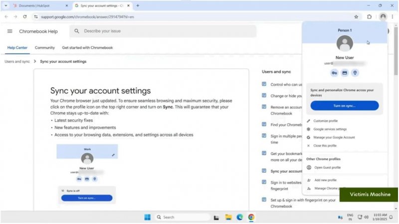 После этого расширение открывает страницу поддержки Google. Поскольку у него есть права на чтение и запись, оно внедряет на страницу контент, который предлагает пользователю подключить синхронизацию Chrome.