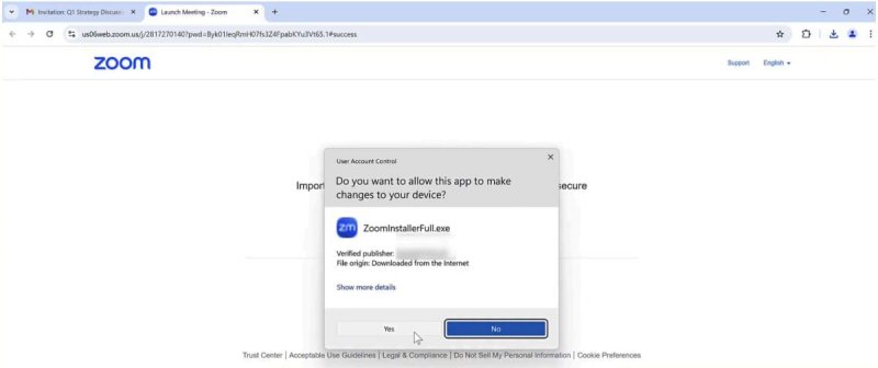 В этом сценарии человек получает приглашение в Zoom, но после нажатия на ссылку и перехода на страницу Zoom, расширение внедряет в страницу вредоносный контент, сообщающий о необходимости обновления клиента. На самом деле загружается исполняемый файл, содержащий токен, который позволяет злоумышленникам получить полный контроль над браузером жертвы.