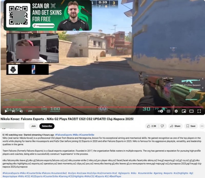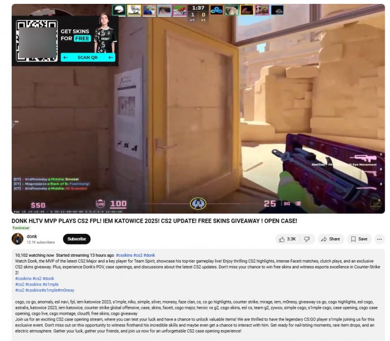 Мошенники ведут стримы на YouTube, рекламируя в них фейковые скины для CS2 и раздачи криптовалют. Каналы, на которых стримят хакеры, обычно представляют собой взломанные легитимные YouTube-аккаунты, для которых злоумышленники провели «ребрендинг», чтобы выдать себя за профессиональных игроков.