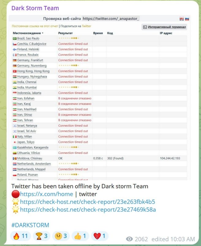 После начала проблем в работе X группировка сообщила в своем Telegram-канале, что проводит DDoS-атаки на социальную сеть, подкрепив свои слова скриншотами и ссылками на check-host.net (1, 2). Этот сайт позволяет проверять доступность сайтов с различных серверов по всему миру и часто используется во время DDoS-атак для проверки доступности ресурсов.