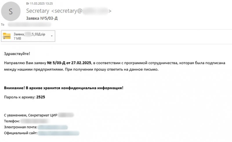 Потенциальные жертвы получали однотипные письма от некоего секретариата с архивом ZIP во вложении. В них отправители просили адресата подтвердить получение информации и ознакомиться с заявкой их архива. Если пользователь открывал вложение, он видел документ-приманку с запросом на ремонт оборудования якобы от одного из министерств.