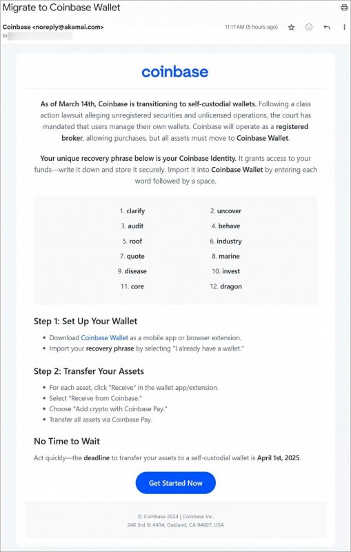 К примеру, в посланиях может содержаться уже готовая seed-фраза для кошелька Coinbase, и пользователю предлагается ввести ее в новый криптокошелек в рамках обновления или миграции. Если человек последует этой инструкции и переведет деньги в новый кошелек с новой seed-фразой, по сути, он предоставит злоумышленникам доступ ко всем своим средствам.