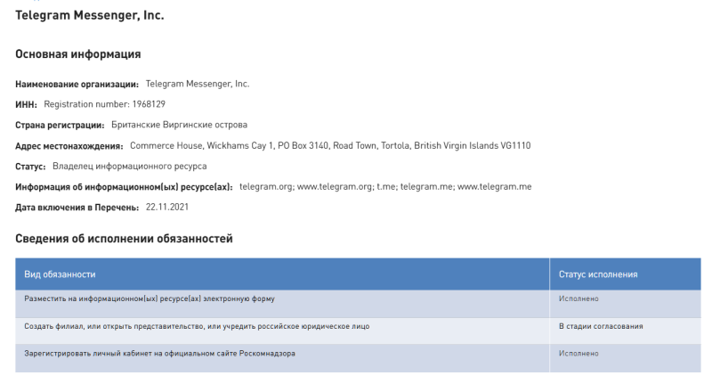 17 июня Telegram-канал «Раньше всех. Ну почти» обратил внимание на то, что на сайте Роскомнадзора, в разделе «Деятельность иностранных лиц в сети интернет на территории Российской Федерации» появились сведения о том, что Telegram находится «в стадии согласования» по созданию филиала, открытия представительства или учреждения российского юрлица. Причем неясно, когда именно обновилась страница Telegram.