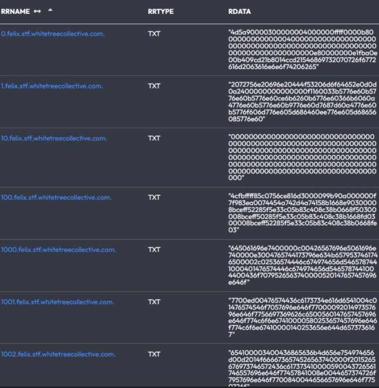 Сначала файл Joke Screenmate был преобразован из двоичного формата в шестнадцатеричный (для представления двоичных значений в виде компактных комбинаций символов). Затем шестнадцатеричное представление разделили на сотни небольших фрагментов, и каждый из них был скрыт в DNS-записи отдельного поддомена whitetreecollective[.]com. В частности, фрагменты были помещены в TXT-запись, где можно хранить любой произвольный текст. TXT-записи часто используются для подтверждения прав собственности на домен при настройке различных сервисов.