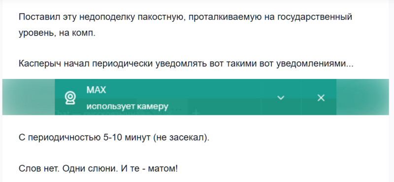 Сегодня в социальных сетях появилась жалоба пользователя, который писал, что десктопная версия мессенджера Max вызывает срабатывания антивируса «Лаборатории Касперского». Защитное ПО предупреждало, что Max использует камеру даже в неактивном состоянии. Разработчики заверили, что Max не запрашивает доступ к камере и не использует ее без активности со стороны пользователя.