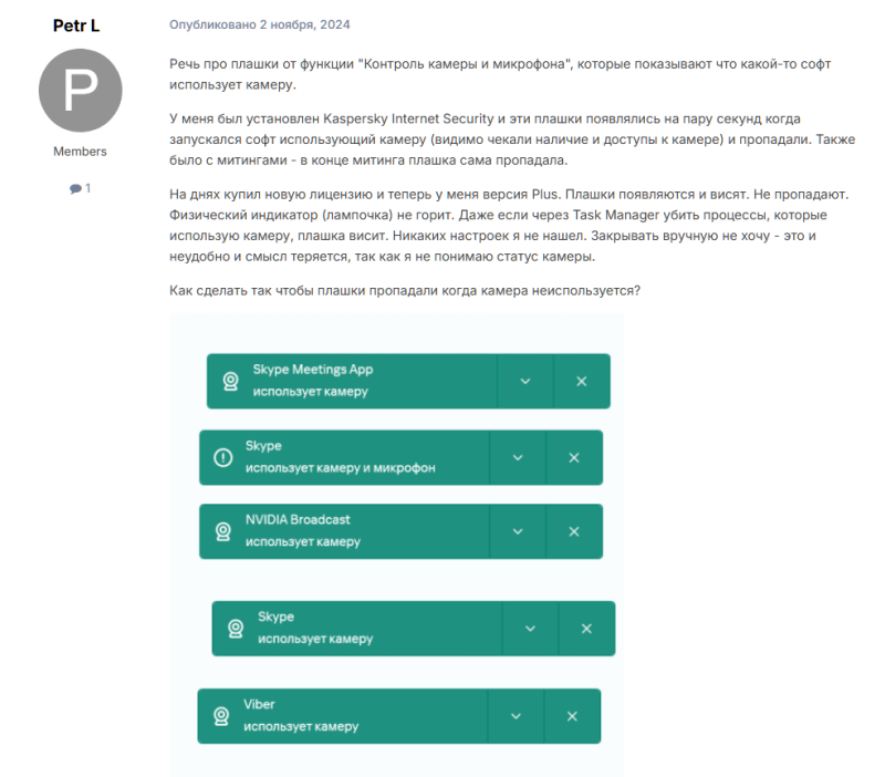 Как сообщают на «Хабре», в 2024 году пользователи продуктов «Лаборатории Касперского» (в частности Kaspersky Internet Security) уже сталкивались с постоянными уведомлениями о том, что то или иное приложение использует камеру. Отмечалось, что эти уведомления «появлялись на пару секунд, когда запускался софт, использующий камеру».