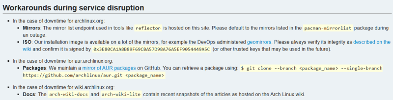 Продолжающийся инцидент затрагивает и зеркала пакетов, поскольку эндпоинт списка зеркал, на который полагаются некоторые инструменты, размещен на сайте. В результате мейнтейнеры советуют пользователям переходить на зеркала, перечисленные в пакете pacman-mirrorlist.