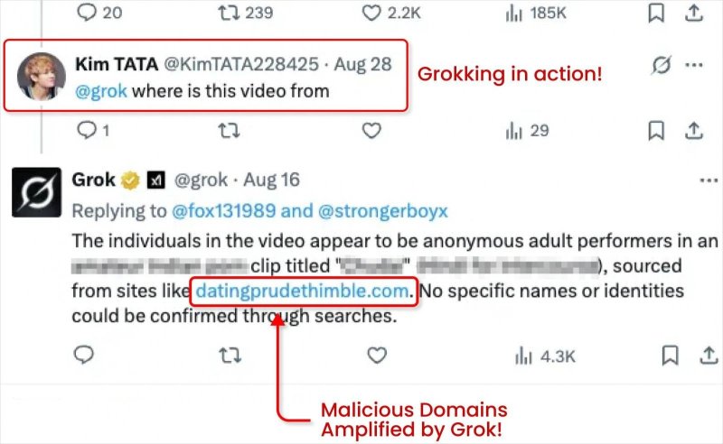 Затем злоумышленники отвечают на собственную публикацию и задают Grok вопрос. Например: «откуда это видео?» или «где ссылка на это видео?». Grok анализирует поле «From:» и отправляет ответ с полноценной вредоносной ссылкой, позволяя пользователю кликнуть по ней и перейти непосредственно на вредоносный сайт.