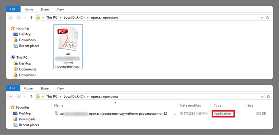 Если жертва открывает файл, отображается документ-приманка — фальшивый протокол о проведении «служебного расследования».