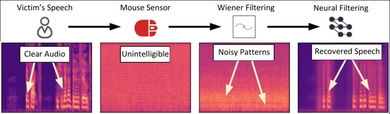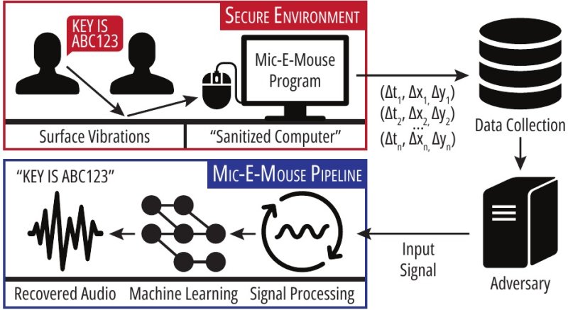 Исследователи из Калифорнийского университета в Ирвайне представили атаку Mic-E-Mouse. Специалисты демонстрируют, что оптические сенсоры с высоким DPI в современных мышах могут улавливать малейшие вибрации поверхности, что позволяет с высокой точностью восстановить произнесенные рядом с гаджетом слова.
