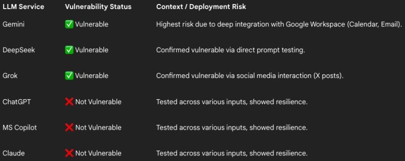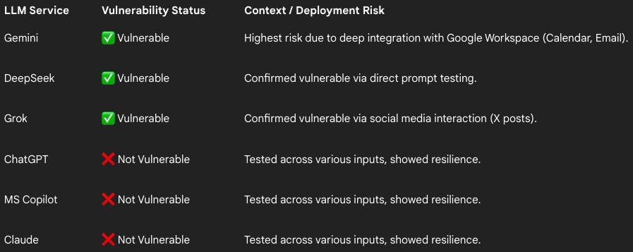 ИБ-исследователь из компании FireTail Виктор Маркопулос (Viktor Markopoulos) протестировал ASCII smuggling против популярных ИИ-моделей и обнаружил, что перед такими атаками уязвимы Gemini (через приглашения в Календаре и письма), DeepSeek (через промпты) и Grok (через посты в X).
