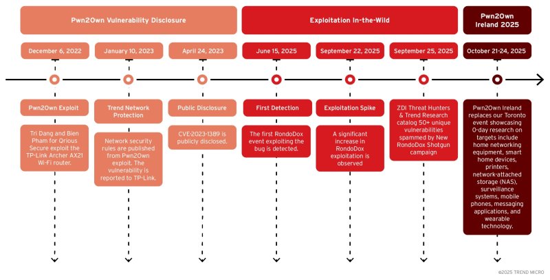 Исследователи сообщают, что среди прочих уязвимостей RondoDox атакует CVE-2023-1389 — баг в Wi-Fi-роутере TP-Link Archer AX21, который изначально был продемонстрирован на Pwn2Own Toronto 2022. Отмечается, что разработчики ботнета внимательно следят за появлением эксплоитов, показанных на Pwn2Own, а затем начинают применять их на практике.