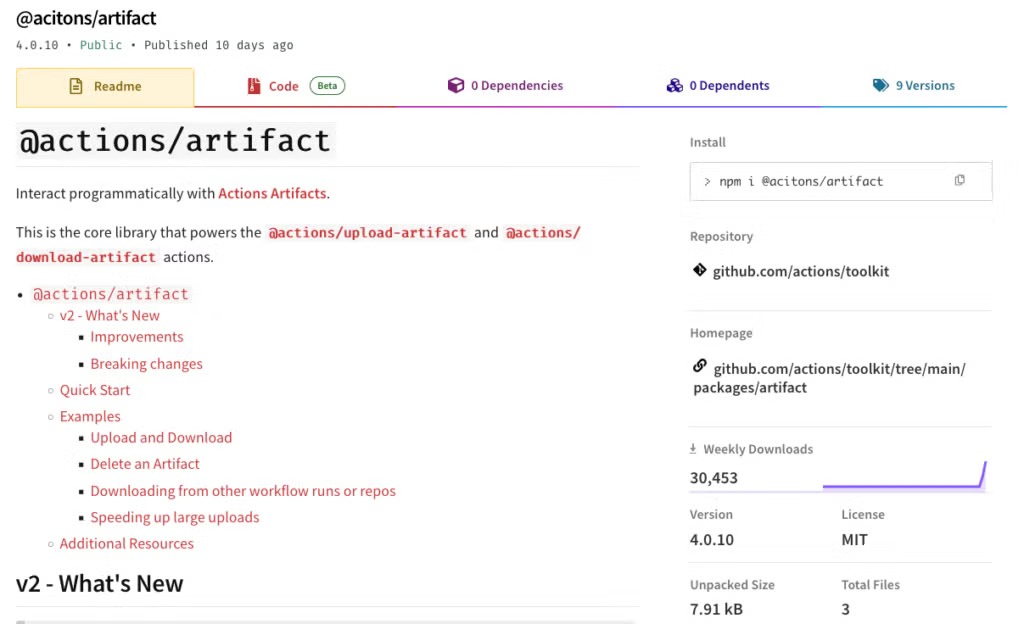 Пакет был загружен в npm 29 октября 2025 года и быстро набрал популярность — он был скачан 47 405 раз, из которых 31 398 пришлись на последнюю неделю. Исследователи пишут, что было шесть вредоносных версий пакета (с 4.0.12 по 4.0.17), которые включали postinstall-хук для автоматической загрузки и запуска малвари. Однако во время изучения атаки, учетная запись blakesdev, от лица которой был загружен acitons/artifact, успела удалить все вредоносные версии — в публичном доступе осталась только «чистая» версия 4.0.10.