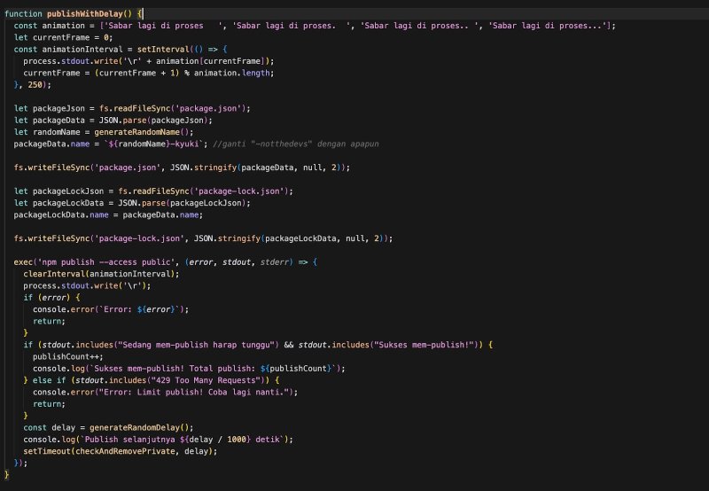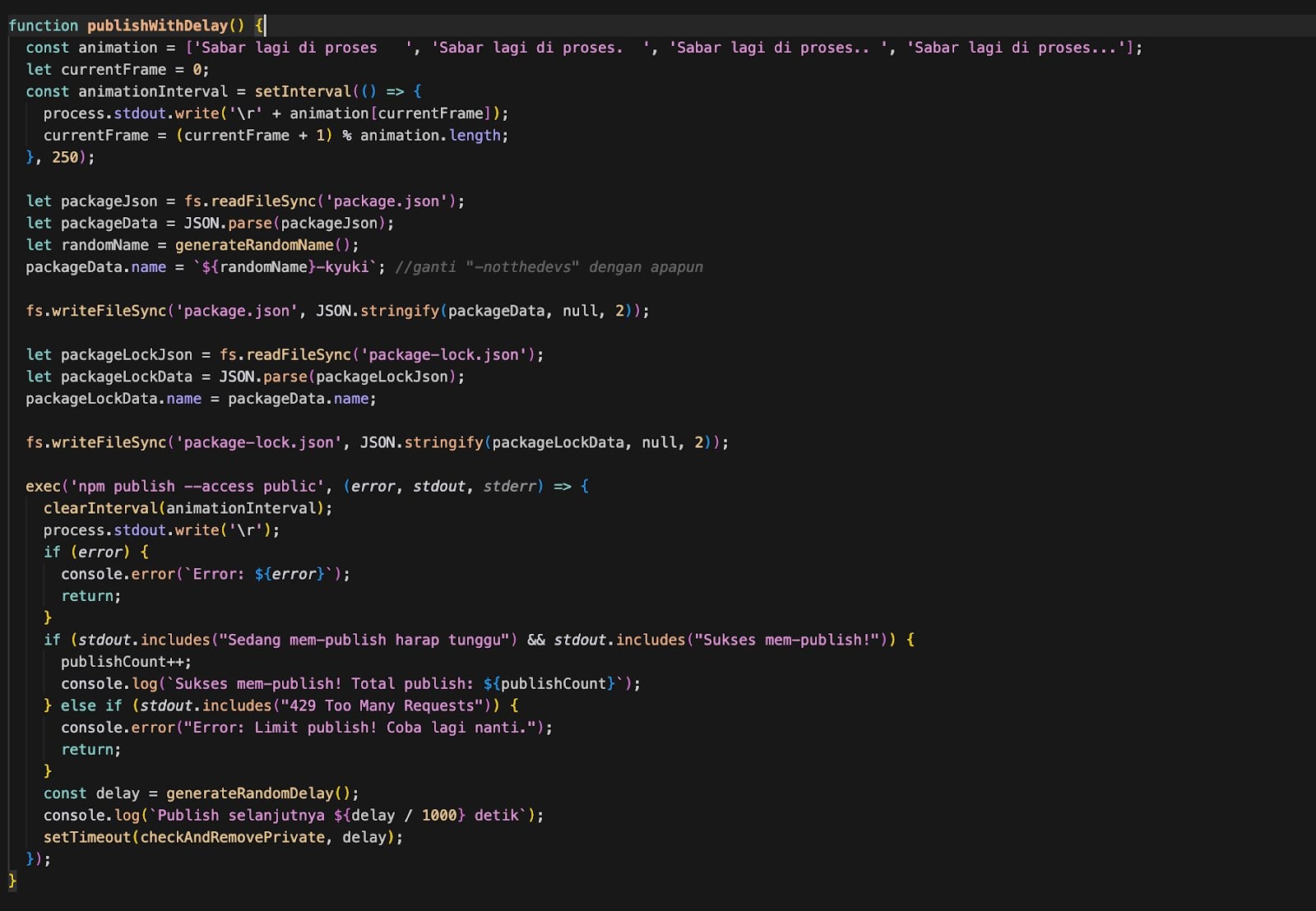 После активации скрипт работает в бесконечном цикле: удаляет "private": true из package.json, генерирует случайное имя из словаря, создает случайный номер версии (чтобы обойти обнаружение дубликатов в npm) и публикует новый пакет через npm publish. Цикл повторяется без остановки — новый пакет появляется каждые 7-10 секунд.