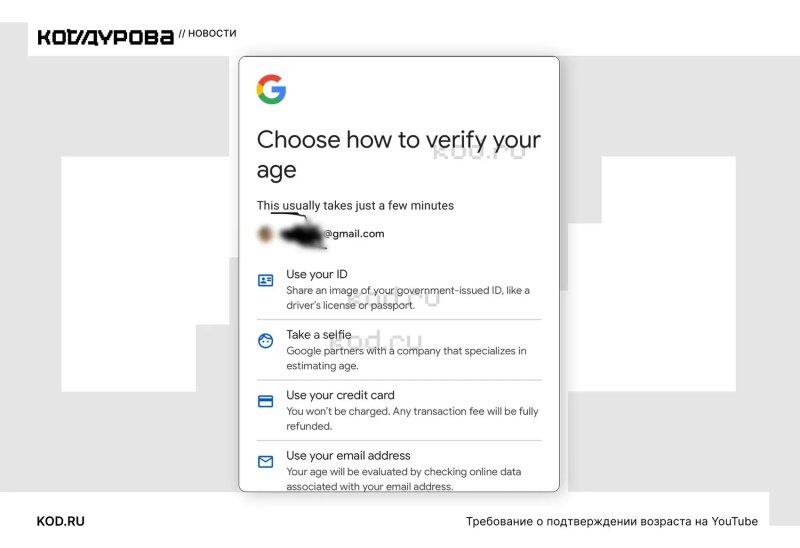 Для верификации возраста YouTube предлагает на выбор несколько вариантов: