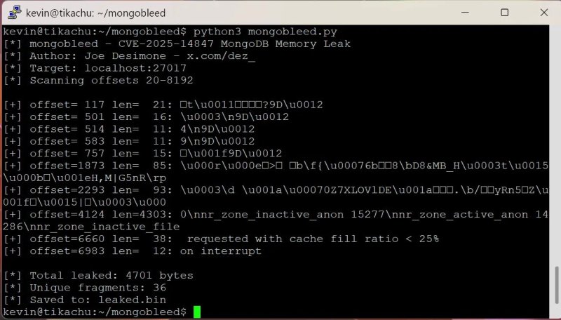 Нужно отметить, что для проблемы MongoBleed уже доступны PoC-эксплоиты. К примеру, аналитик компании Elastic создал эксплоит, который ориентирован именно на утечку конфиденциальных данных из памяти.