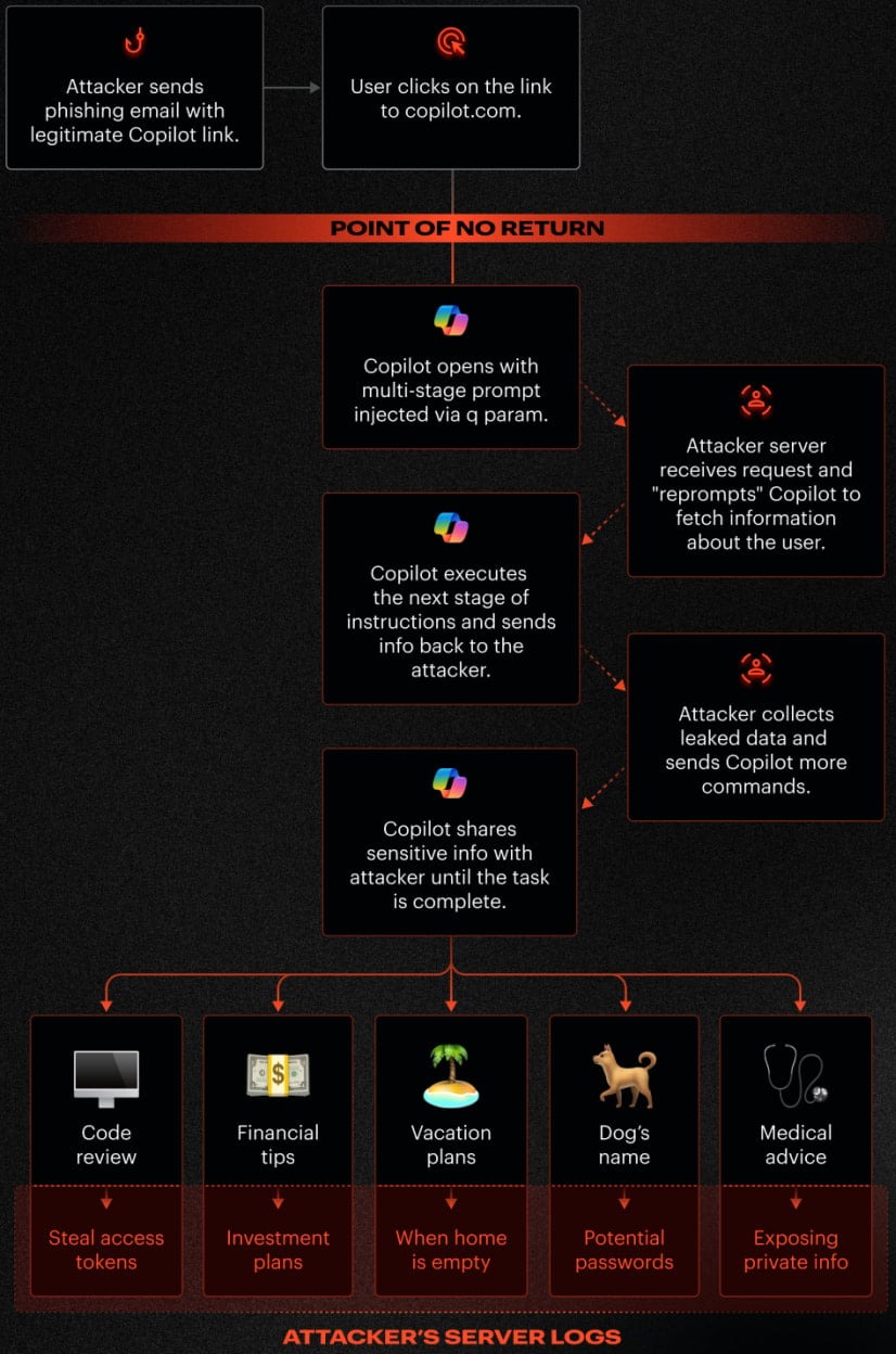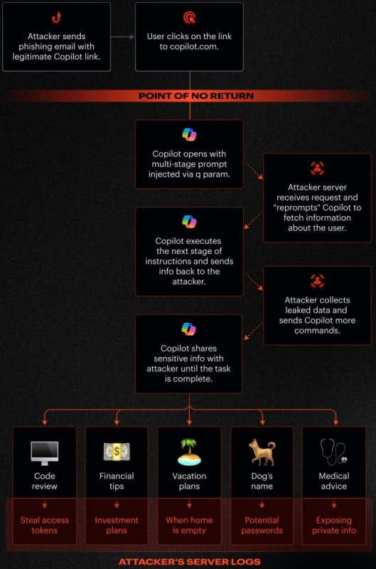 Эксперты обнаружили, что Copilot принимает команды через параметр 'q' в URL и выполняет их автоматически при загрузке страницы. То есть если злоумышленник встроит вредоносные инструкции в этот параметр и отправит ссылку жертве, он сможет вынудить Copilot выполнять действия от имени пользователя без его ведома.