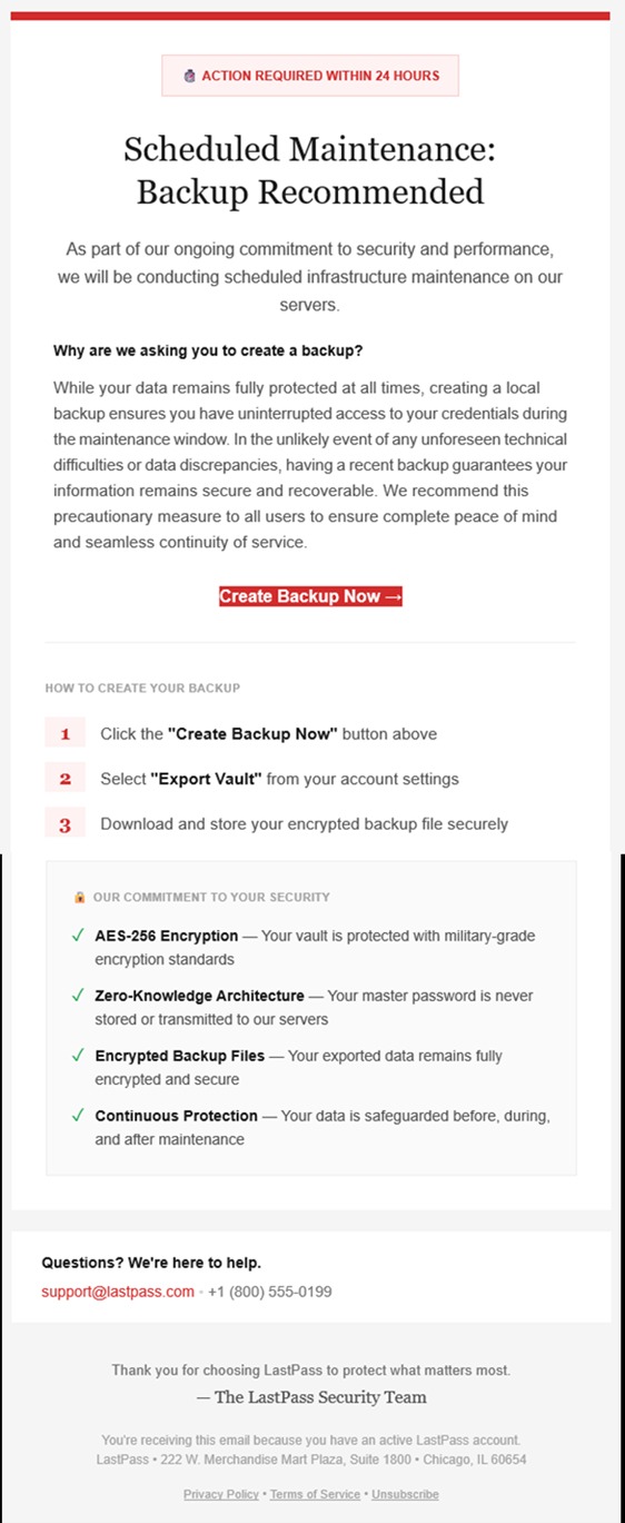 Письма оформлены как настоящие уведомления от LastPass. В них говорится, что пользователям нужно срочно создать локальные резервные копии своих хранилищ из-за предстоящего техобслуживания инфраструктуры компании.