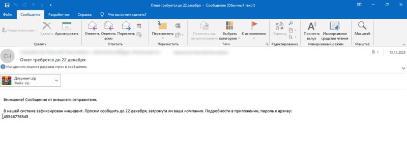Дополнительно в течение нескольких дней после публикации Punishing Owl запустила email-рассылку на адреса контрагентов взломанной организации. Сначала письма исходили от имени самой группировки с адреса punishingowl@[REDACTED], а спустя час началась вторая волна — уже от имени сотрудника жертвы. В письмах содержался вредоносный ZIP-архив, замаскированный под срочные документы.