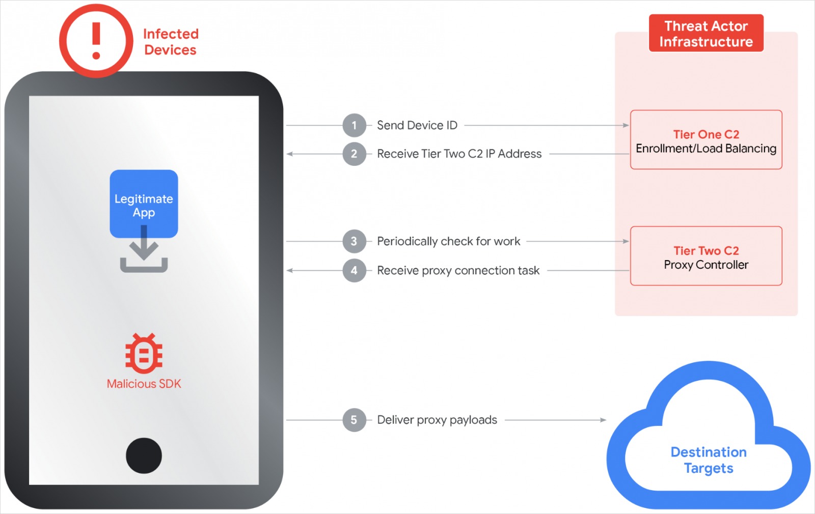 Отчет Google гласит, что IPIDEA заражала устройства жертв через не менее 600 вредоносных Android-приложений со встроенными прокси-SDK (Packet SDK, Castar SDK, Hex SDK, Earn SDK), а также использовала более 3000 вредоносных Windows-файлов, маскировавшихся под OneDriveSync или Windows Update. Некоторые приложения продвигались под видом VPN-сервисов, незаметно превращая устройства в прокси-узлы без ведома их владельцев.
