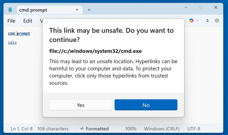 Если пользователь открывал такой файл в «Блокноте» версии 11.2510 или более ранней, переключался в режим Markdown и кликал по ссылке, указанная программа запускалась без какого-либо предупреждения со стороны Windows. Более того, ссылки могли указывать на файлы в удаленных SMB-шарах, что расширяло возможности для атаки.