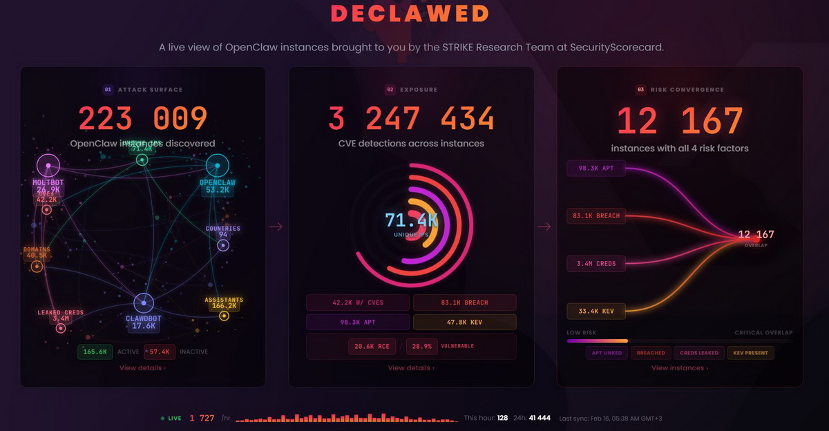 Теперь же эксперты SecurityScorecard подсчитали, что десятки тысяч уязвимых инстансов OpenClaw свободно доступны через интернет по всему миру. Отметим, что цифры в live-дашборде компании быстро растут в реальном времени. Когда на прошлой неделе исследователи только опубликовали свой отчет, сообщалось о 135 000 доступных инстансов, теперь же их насчитывается более 220 000.