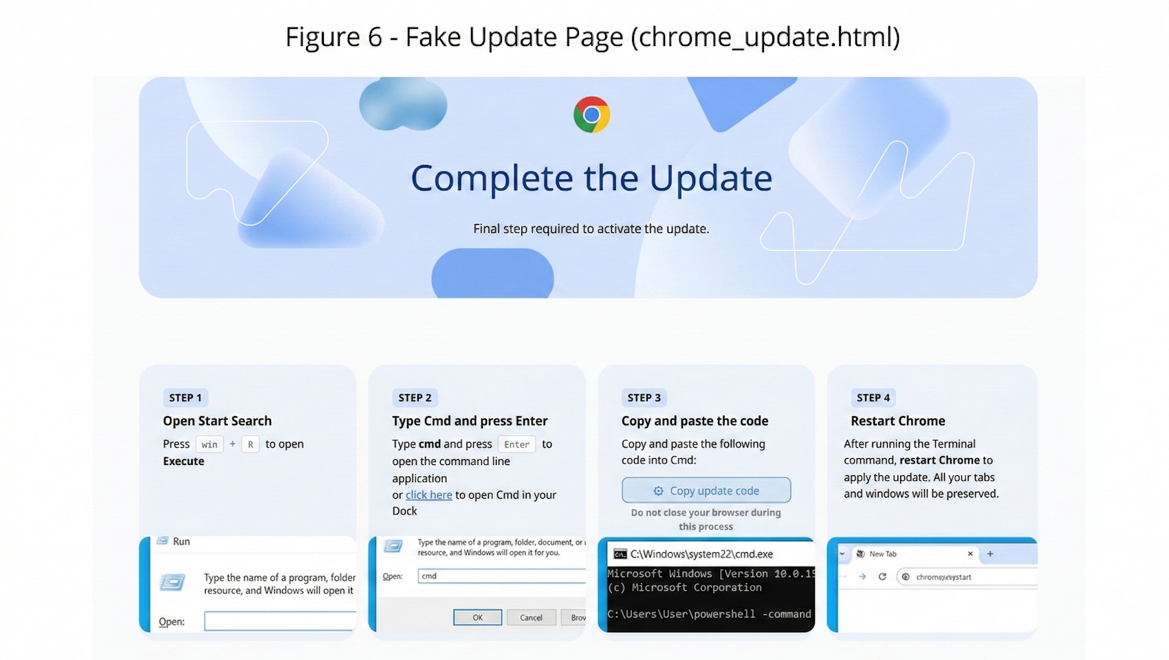 В случае ShotBird расширение показывает жертве фейковое сообщение об обновлении Chrome и через ClickFix-атаку вынуждает пользователя открыть диалог «Выполнить» в Windows, запустить cmd.exe и вставить туда PowerShell-команду. В результате на машину жертвы загружается исполняемый файл googleupdate.exe. В случае запуска малварь перехватывает данные, введенные в формы на веб-страницах (пароли, PIN-коды, данные карт, токены), а также похищает сохраненные в Chrome пароли и историю просмотров.