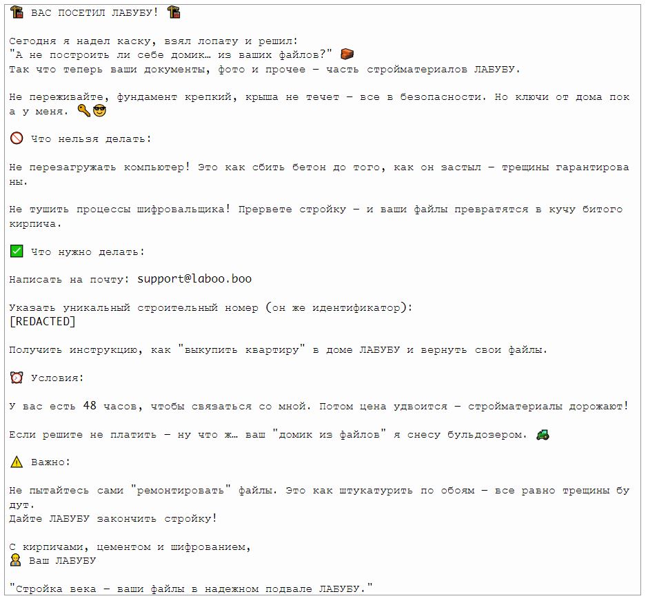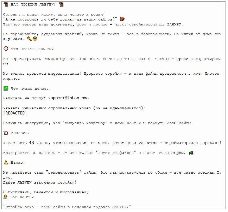 По словам исследователей, отдельного внимания заслуживают записки с требованием выкупа, которые хакеры оставляют жертвам. Toy Ghouls адаптируют текст этих посланий под конкретную отрасль и компанию. К примеру, строительной компании сообщают, что их «посетил Лабубу», и угрожают «снести домик из файлов бульдозером». Нефтегазовому предприятию объясняют, что «цена на баррель шифрования» удвоится через 48 часов.