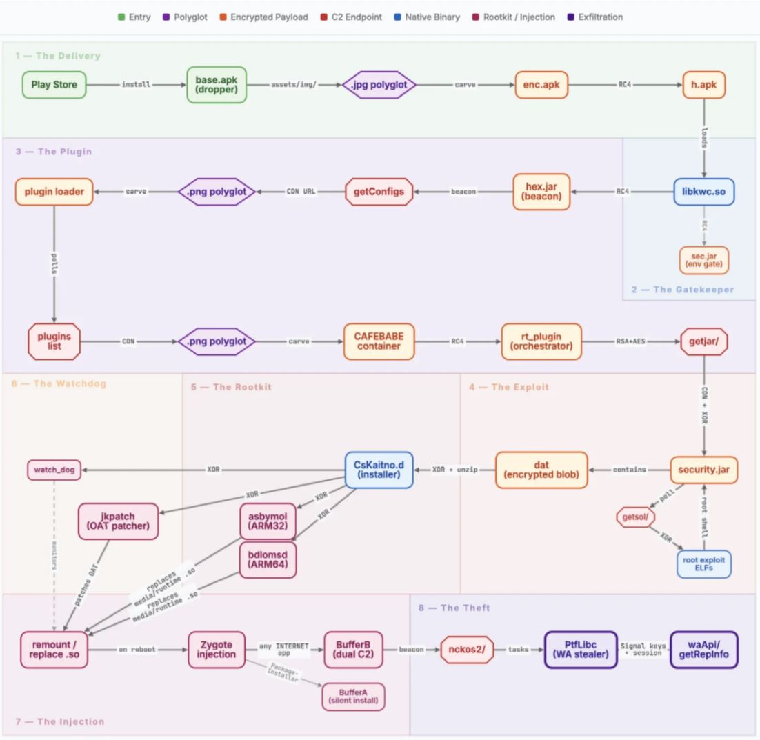 На этапе постэксплуатации вредоносный код внедряется в каждое запускаемое на устройстве приложение. Но главная цель злоумышленников — мессенджер WhatsApp. При запуске мессенджера малварь извлекает базы данных с шифрованием, ключи протокола Signal, номер телефона и данные бэкапа Google Drive. Все это отправляется на управляющий сервер, что позволяет операторам малвари клонировать WhatsApp-сессию жертвы на своем устройстве.