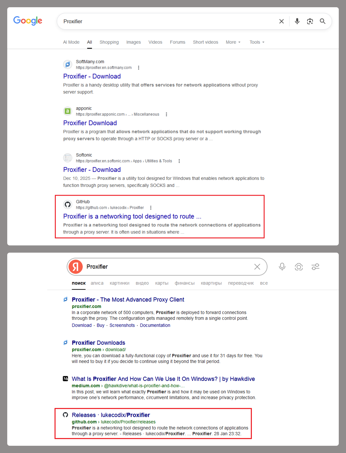 Аналитики рассказали, что ссылка на вредоносный репозиторий на GitHub находится в топе поисковой выдачи по запросу «Proxifier». В репозитории размещен исходный код простого прокси-сервиса, а вот в релизной ветке лежит архив с исполняемым файлом и ключами активации.