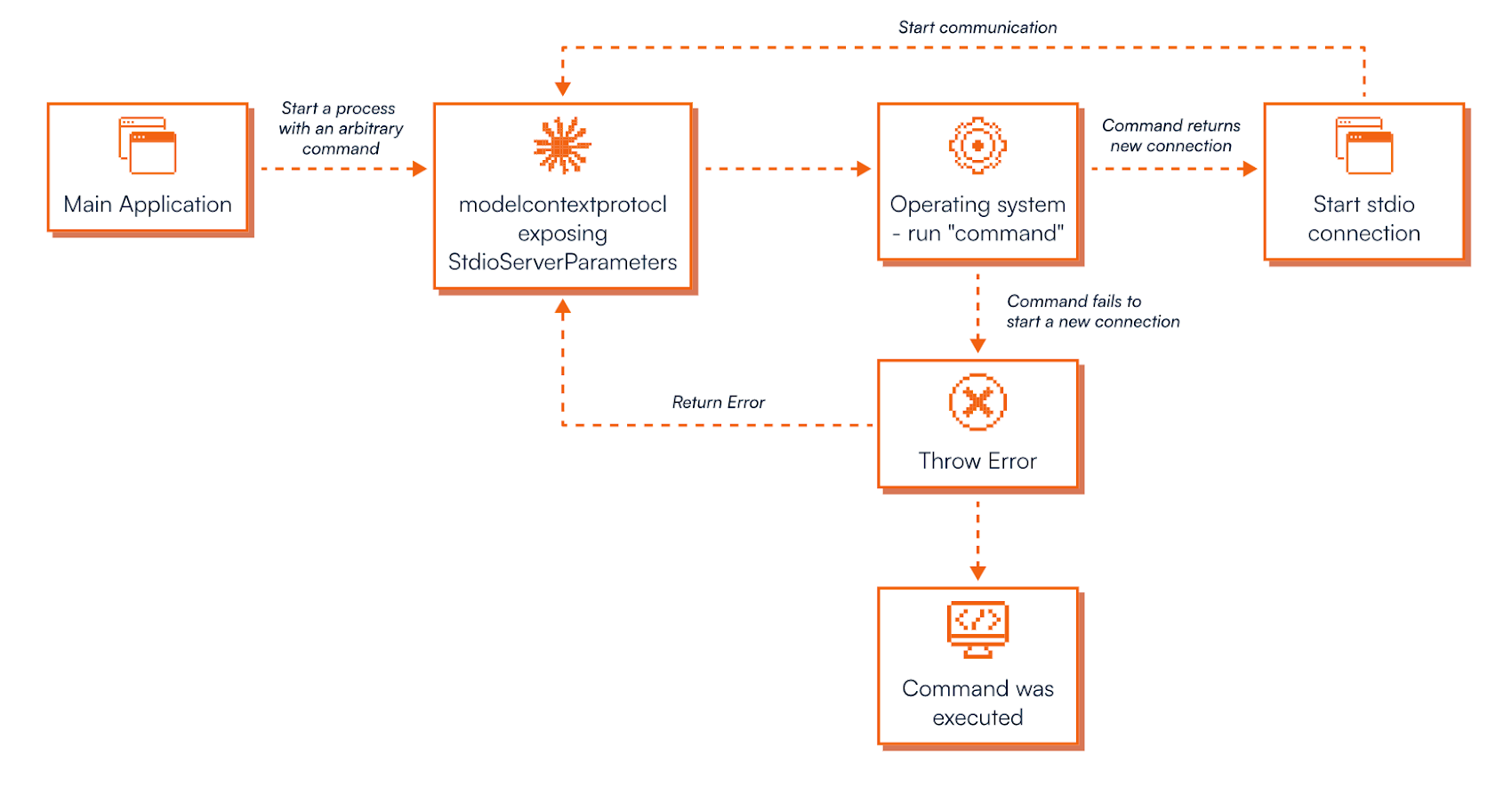 По замыслу разработчиков, STDIO запускает MCP-сервер как подпроцесс и передает его хендл обратно LLM. Однако на практике механизм позволяет выполнять произвольные команды на уровне ОС: если команда успешно создает STDIO-сервер, возвращается хендл, а если нет — возвращается ошибка, однако команда к тому моменту уже выполнена.