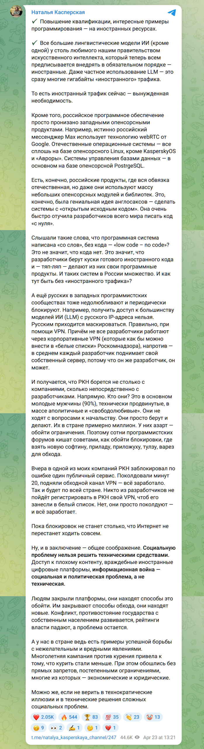 «И получается, что РКН борется не столько с компаниями, сколько непосредственно с разработчиками. Напрямую. Кто они? Это в основном молодые мужчины (90%), технически продвинутые, в массе аполитичные и “свободолюбивые”. Они не ходят с вопросами к начальству. Они просто берут и делают. Их в стране примерно миллион, — резюмирует Касперская. — Вчера в одной из моих компаний РКН заблокировал по ошибке один публичный сервис. Поколдовали минут 20, подняли обходной канал VPN — все заработало. Так и будет по всей стране. Никто из разработчиков не пойдет регистрировать в РКН свой VPN, чтоб его занесли в белый список. Нет, они просто поколдуют — и все заработает. Пока блокировок не станет столько, что интернет не перестанет ходить совсем».