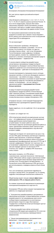 Президент ГК InfoWatch и сооснователь «Лаборатории Касперского» Наталья Касперская опубликовала в своем Telegram-канале развернутый пост (1, 2), в котором заявляет, что эффективно заблокировать VPN, не обрушив работу российского интернета, невозможно. Касперская пишет, что ассоциация разработчиков программных продуктов (АРПП) «Отечественный софт» направила письмо председателю правительства и руководителю администрации президента с аналогичной позицией.