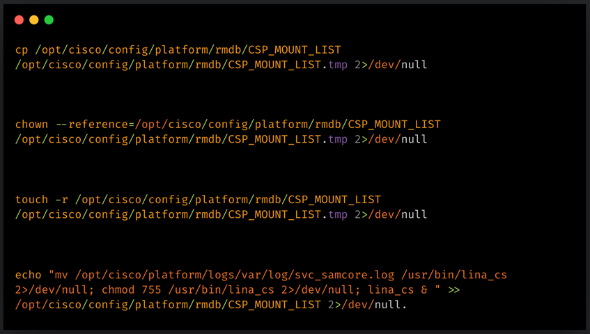 Firestarter модифицирует загрузочный файл CSP_MOUNT_LIST, чтобы запускаться при старте системы, хранит свою копию в /opt/cisco/platform/logs/var/log/svc_samcore.log, а при необходимости восстанавливает ее в /usr/bin/lina_cs, где работает в фоновом режиме.